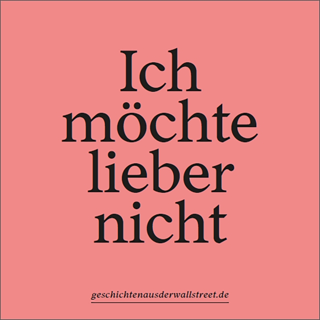 Geschichten aus der Wall StreetiCh mÖhCte liEbEr NihCt« von Rafael Ossami Saidy nach Herman Melville | Regie: Rafael Ossami SaidyAdaptiert von der Novelle »Bartleby, der Schreiber« von Herman Melville, setzt sich das Stück Geschichten aus der Wall Street iCh mÖhCte liEbEr NihCt mit dem Moment des Widerstands und der Kraft des »Ich möchte lieber nicht« auseinander und stellt die Frage nach dem Ansteckungspotential der Subversion. Über 6 Stunden entwickelt sich langsam diese Theaterinstallation, die die Frage nach der Möglichkeit eines anderen, utopischen Wegs stellt. Weiter hier…