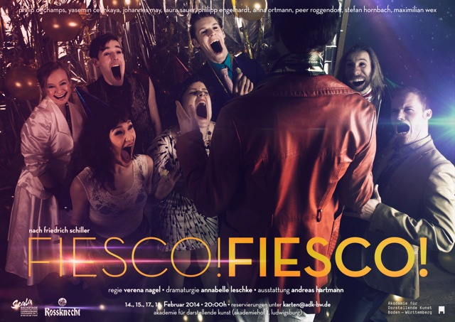 Es spielen: Fiesco: Philip Dechamps - Verrina: Johannes May - Gianettino: Philipp Engelhardt - Leonore: Anna Ortmann - Bertha: Laura Sauer - Julia: Yasemin Cetinkaya - Muley Hassan: Peer Roggendorf - Sacco: Stefan Hornbach - Bourgognino: Maximilian Wex